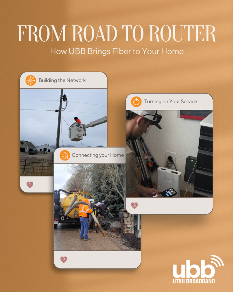 At Utah Broadband, we’re proud to invest in local communities by building and maintaining a high-quality fiber network. Whether your fiber is run underground or aerially, the goal is the same: delivering reliable, blazing-fast internet from the road to your home, and into your living room.